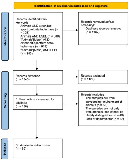 Our search uncovered 2430 bibliographic references to articles published between 1 January 2021 and 30 June 2022. Thereafter, 1187 duplicate records were removed. Finally, 1243 references remained for screening. The PRISMA 2020 flow diagram [81] for literature screening can be viewed in Figure 2. After the screening of the 1243 records, 1123 records did not match the type of articles we wanted to include. Hence, 120 pieces of full-text literature were assessed for eligibility. Sixty-five of them were excluded because the samples were from the surrounding environment of animals, not from animals themselves. Forty-three of them were excluded because the samples were not only from animals but also from humans or the environment, which could not be distinguished based on the content of the article. Twelve articles were excluded because no denominator (whether the number of animals, number of samples, or number of cultured bacteria) was provided. Finally, 30 documents were selected for further review and analysis.