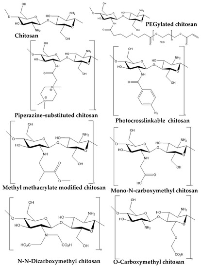 - Wang, W.; Meng, Q.; Li, Q.; Liu, J.; Zhou, M.; Jin, Z.; Zhao, K. Chitosan Derivatives and Their Application in Biomedicine. Int. J. Mol. Sci. 2020, 21, 487. [Google Scholar] [CrossRef]