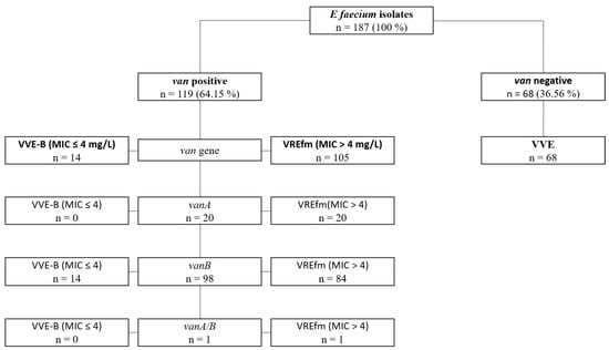 A total of 187 E. faecium strains from various clinical specimens (27 strains: blood culture, 24 samples: stool, 75 strains: urine, 70 strains: various clinical specimens, e.g., biopsies, punctates) were included in this study. Clinical specimens were incubated on non-selective media and stool samples on VRE-selective media (chromID® VRE) for up to 48 h. Identification was performed by MALDI-TOF MS (Bruker Daltonic GmbH, Bremen, Germany) and vancomycin resistance was determined by Vitek2 (bioMérieux) in accordance with the current routine laboratory procedure. Vancomycin-resistance was defined in accordance with the EUCAST breakpoints (MIC > 4 mg/L).