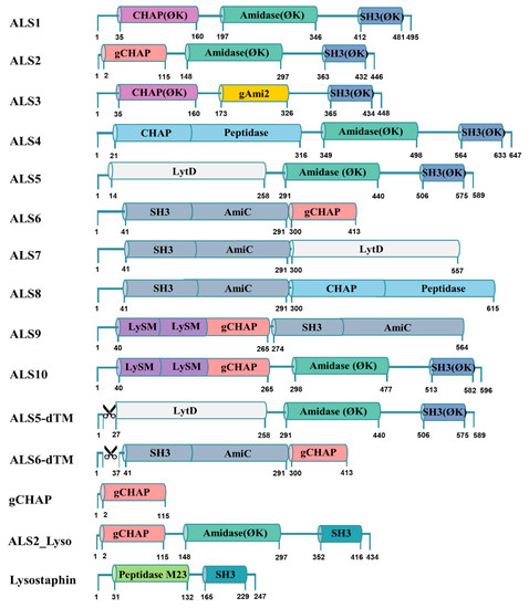 We previously reported the genome sequences of ALS1, ALS2, and ALS3 [38]. Briefly, ALS1 is a codon-optimized bacteriophage K lysin (codop-LysK) consisting of CHAP(ϕK)-Amidase(ϕK)-SH3(ϕK) domains; ALS2 is a fusion gene composed of the CHAP domain (gCHAP) of SsaA-like protein and amidase(ϕK) and SH3(ϕK) domains of codop-LysK; ALS3 is a fusion gene of the amidase domain of autolysin (Atl_1) and CHAP (ϕK) and SH3 (ϕK) of LysK. ALS4, 5, and 10 are generated by the fusion of LytM (CHAP-peptidase), LytD and SsaA-like protein genes with amidase(ϕK) and SH3(ϕK) of LysK, respectively. ALS 6, 7, 8, and 9 are generated by the fusion of LytH (SH3-AmiC) with gCHAP, LytD, LytM, and SsaA-like protein genes, respectively. The full length of the lysostaphin gene was codon-optimized and synthesized as previously reported [58], and only the functional region (142–387) was amplified. The structure of chimeric lysins and reference genes of each domain were summarized in Table S1 and Figure 1. Each domain for fusion was amplified using the primers listed in Tables S2, S3 and S5 and ligated by splicing using overlap extension PCR (SOE-PCR, the mixture was composed 10 μL of 10× buffer (1 μL), dNTPs (2.5 mM, 1 μL) TaKaRa Ex Taq DNA polymerase (5 U/μL, 0.1 μL) distilled water (6.9 μL), and template DNA of each (50 ng/μL, 1.5 μL). The mixture was incubated for 10 cycles of 95 °C for 45 s; 58 °C for 45 s; 72 °C for 2 min) [59] to clone into TA vector.