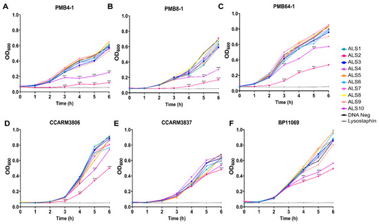 Screening of antibacterial activity of chimeric lysin candidates. Chimeric lysin candidates were prepared using cell-free expression system and antibacterial activity was tested using turbidity reduction test. Antibacterial activities of chimeric lysin candidates were tested on S. aureus strains from bovine mastitis: (A) PMB4-1, (B) PMB8-1, and (C) PMB64-1; from human infection: (D) CCARM3806 and (E) CCARM3837; and from chicken infection (F) BP11069 for 6 h. Cell-free expression reaction with lysostaphin DNA template without DNA template were used as positive and negative controls, respectively. All experiments were performed in triplicate samples and independent experiments were duplicated for PMB8-1 and CCARM3806. Single experiment was performed for other strains. The median values are shown. Data were analyzed by one-way ANOVA followed by Dunnett’s test to determine the significance relative to the negative control. (*** p < 0.001, ** p < 0.01, * p < 0.05).