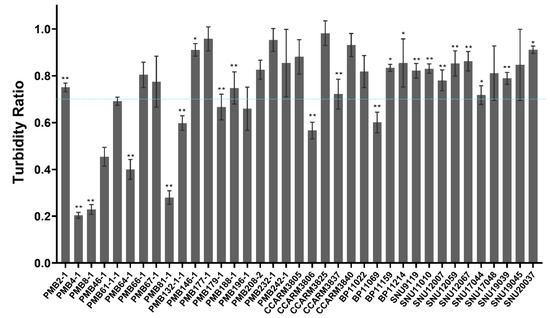 Different susceptibility of S. aureus strains to ALS2. After 6 h incubation of bacteria and ALS2, the turbidity ratio (TR) for each strain was determined by calculating the OD600 value ratio of ALS2-treated to untreated samples. All experiments were performed in triplicate samples and independent experiments were triplicated for PMB2-1, PMB4-1, PMB8-1, PMB64-1, PMB67-1, PMB179-1, and CCARM3806, and duplicated for PMB66-1, PMB196-1, CCARM3837, CCARM3840, and BP11069. Single experiment was performed for other strains. The mean ± standard deviation of TR values is presented. In total, 37 strains from bovine mastitis (18 PMB strains), human infection (5 CCARM strains), and chicken infection (14 BP/SNU strains) were compared. The broken line represents the reference TR (0.7). The significance of the OD values of ALS2 treated and untreated strain was analyzed by t-test. (n = 3, ** p < 0.01, * p < 0.05).
