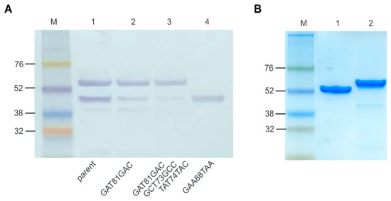 To reduce the subprotein without functional loss of ALS2, synonymous point mutations were introduced to the second transcription start sites (TSS), −10 (GAT81GAC), −34 (GCT73GCC), and −31 (TAT74TAC). The single (GAT81GAC) and triple (GAT81GAC, GCT73GCC and TAT74TAC) mutations significantly decreased the expression level of the subprotein (Figure 4A). The mutated ALS2 gene containing the triple mutations and ALS1 genes were expressed in E. coli and purified by Ni-NTA affinity chromatography and gel filtration (Figure 4B). The total amounts of ALS2 and ALS1 purified per volume of cell culture were 2.711 and 1.258 mg/L, respectively. All the purified proteins were aliquoted and stored at −70 °C until use, and ALS1 was observed to degrade more rapidly into multiple bands than ALS2 over time.