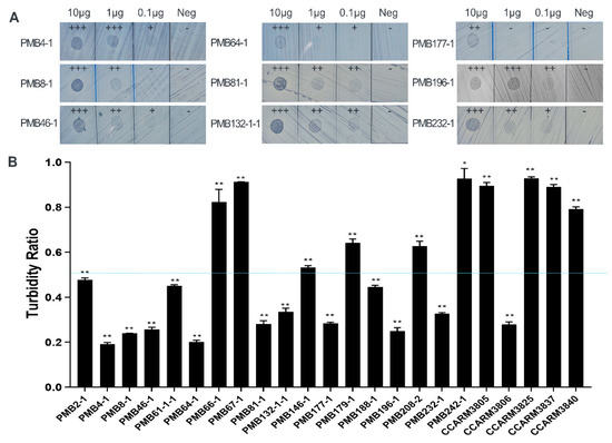 Screening of antibacterial activity of proteins produced by cell-free protein synthesis was conducted as previously described with modifications. The PMB strains were diluted in TSB to 1 × 107 colony-forming units (CFU)/mL. Bacteria (100 μL) and 10 μL of protein were mixed in a 96-well plate. The culture was grown for 6 h with shaking at 200 rpm in a 37 °C incubator, and the OD600 value was recorded every hour. Turbidity reduction assays were used in testing as previously described with minor modifications [25,60]. Briefly, S. aureus was grown to mid-log phage (OD600 = 0.5) and then centrifuged at 3000× g for 10 min. After resuspending the cells in protein buffer until OD600 = 1.0, 200 µL was used in each well of a 96-well plate. Protein (10 µL) containing a concentration of 10 µg was mixed in the 96-well plate, and the OD value was measured after 10 min. Controls contained only protein storage buffer instead of purified protein. The plate lysis test was tested by modifying a previous method [54]. In brief, bacteria cells were grown to mid-log phage (OD600 = 0.4~0.6) at 37 °C in TSB. The S. aureus cells spread on tryptic soy agar (TSA) plates and air-dried for 10 min. Purified protein was diluted by concentration (10 µg, 1 µg, 0.1 µg) in 10 µL of protein buffer and spotted onto a fresh lawn. The plate was air-dried for 10 min and incubated at 37 °C for 20 h.