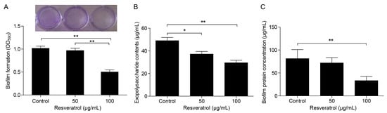 Crystal violet staining results showed that 100 μg/mL resveratrol significantly inhibited biofilm formation compared to the control group, while 50 μg/mL resveratrol did not dramatically change the biofilm formed by A. hydrophila NJ-35 (Figure 1A). With increasing concentrations of resveratrol, the amount of biofilm reduced to 90.27 ± 0.11% and 49.34 ± 0.10% at 50 and 100 μg/mL resveratrol, respectively. In addition, both 50 and 100 μg/mL resveratrol decreased the exopolysaccharides (EPS) production (Figure 1B), and 100 μg/mL resveratrol noticeably repressed the total biofilm protein production of A. hydrophila NJ-35 (Figure 1C). The above three experimental results showed a similar trend; that is, the indicators of biofilm formation sequentially decreased following the increasing concentrations of resveratrol.