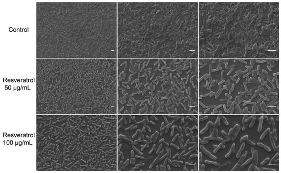 The inhibitory effect of resveratrol on the biofilm formation of A. hydrophila NJ-35 was observed using SEM. Overnight bacterial culture was normalized to 1 × 107 CFU/mL and diluted 1:100 in LB medium with 50 and 100 μg/mL resveratrol, respectively, and 0.1% (v/v) DMSO was added as a control. Pre-sterilized coverslips (Φ = 14 mm) were placed into 12-well plates, then 1 mL bacterial dilution was dispensed to each well and incubated at 28 °C for 48 h. The slides were rinsed well with PBS and fixed with 2.5% glutaraldehyde for 4 h. The samples were dehydrated with a series of gradient acetone (10, 30, 50, 70, 90, and 100%, v/v) for 15 min, and dehydrated in 100% acetone twice. Finally, the sample was observed under a scanning electron microscope (S-4800, Hitachi, Tokyo, Japan). Nine random positions in three independent experiments were chosen for microscopic analysis.