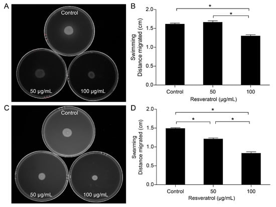 An LB medium with 0.3% agar for swimming motility and 0.5% agar for swarming motility were prepared, as described previously. Resveratrol was added to the LB agar to final concentrations of 50 or 100 μg/mL. Additionally, DMSO (0.1%) was added as a control. Overnight bacterial culture was normalized to 1 × 107 CFU/mL with the LB medium. Then, 5 μL culture was spotted into the middle of the plate and incubated at 28 °C for 24 h. Motility was assessed by measuring the migration diameter of bacteria from the inoculation point to the periphery of the plate.