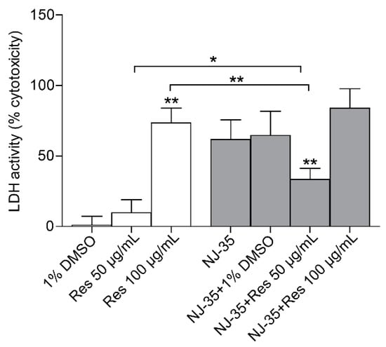 LDH release of J774A.1 cells with or without A. hydrophila NJ-35 treatment, and the indicated concentrations of resveratrol. The data were presented as the mean ± SD (n = 6). * p < 0.05, ** p < 0.01.