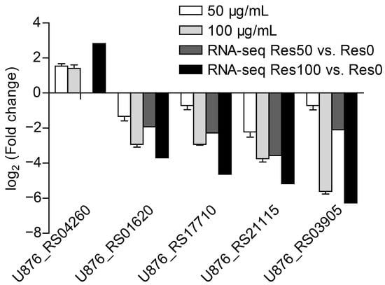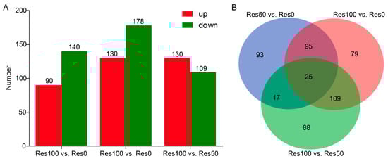 Using the criteria of fold-change ≥ 2 and p-value < 0.05, we identified 230 (90 up- and 140 downregulated) and 308 DEGs (130 up- and 178 downregulated) in the presence of 50 and 100 μg/mL resveratrol compared to cultures grown without resveratrol, respectively, of which 120 DEGs were common in both datasets (Figure 5A). After comparing Res 100 and Res 50 groups, 242 DEGs (130 up- and 109 downregulated) were detected, of which 17 DEGs also occurred in Res 50 vs. Res 0, but not in Res 100 vs. Res 0; and 109 DEGs appeared in Res 100 vs. Res 0, but not in Res 50 vs. Res 0 (Figure 5B).