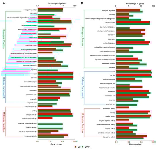 GO functional annotation for DEGs. (A) Res 50 vs. Res 0 groups. (B) Res 100 vs. Res 0 groups.