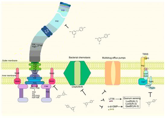 Resveratrol (3,5,4′-Trihydroxystilbene) is a small natural plant polyphenol belonging to the stilbene family. The stilbene structure consists of precisely two aromatic rings and phenolic hydroxyl groups with double bonds (C6-C2-C6 carbon skeleton) [18]. Resveratrol is present in various plants, such as grapes, berries, peanuts, and is also found in high concentrations of red wine. It exists both in a cis- and trans-isomer, with the trans-isomer being the predominant form in plants and the most studied due to its greater availability and higher stability [18]. Resveratrol exhibits antioxidant, anti-inflammatory, immunomodulatory, cardioprotective, and neuroprotective effects, as well as potential therapeutic effects on diabetes, cancer, and Parkinson’s disease [18,19,20]. In addition, resveratrol has antibacterial, anti-viral, and antifungal activity [21]. As a natural product, resveratrol was demonstrated to be an effective antibiofilm and anti-QS agent for several bacterial pathogens [22,23,24,25]. The antibiofilm effect of resveratrol (0.02 mg/mL) on Escherichia coli is mediated by repressing the expression of genes related to curli production, motility, and AI-2 QS system [10]. In methicillin-resistant Staphylococcus aureus (MRSA), 150 μg/mL resveratrol inhibited biofilm formation by disturbing the expression of genes associated with QS, surface and capsular polysaccharides [24]. As for Fusobacterium nucleatum, resveratrol attenuated the biofilm formation by decreasing the expression of genes involved in QS and virulence [22]. Resveratrol may inhibit bacterial biofilm formation by disturbing the QS system. Furthermore, resveratrol (≥100 μg/mL) had no antibiofilm activity on S. aureus ATCC6538 [26,27]. The molecular mechanism of the antibiofilm effect of resveratrol may be different among various bacteria.
