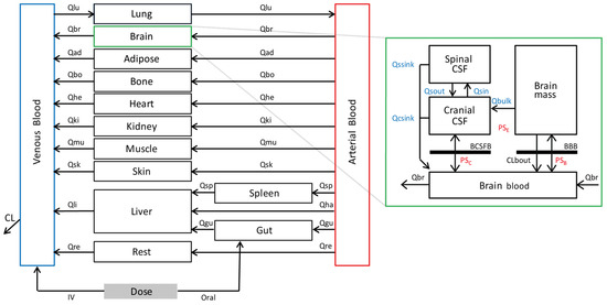 Schematic outline of the PBPK model, including four CNS compartments, adapted from Verscheijden et al. (2019) [20], with permission. Qsin and Qsout represent CSF shuttle flow between cranial CSF and spinal CSF compartments. Qssink and Qcsink are the flows from CSF compartments to blood. Qbulk represents bulk flow from brain mass to cranial CSF. PSB, PSC, and PSE represent permeability surface area products between brain blood and brain mass, brain blood and cranial CSF, and brain mass and cranial CSF, respectively. CLbout represents overall clearance of efflux transporters P-gp and BCRP expressing at BBB. Subscripts lu, br, ad, bo, he, ki, mu, sk, li, re, gu, sp, and ha denote lung, brain, adipose tissue, bone, heart, kidney, muscle, skin, liver, rest tissue, gut, spleen, and hepatic artery, respectively. CL is the total clearance from the model. IV is an intravenous dose, and oral is an oral dose route of administration.