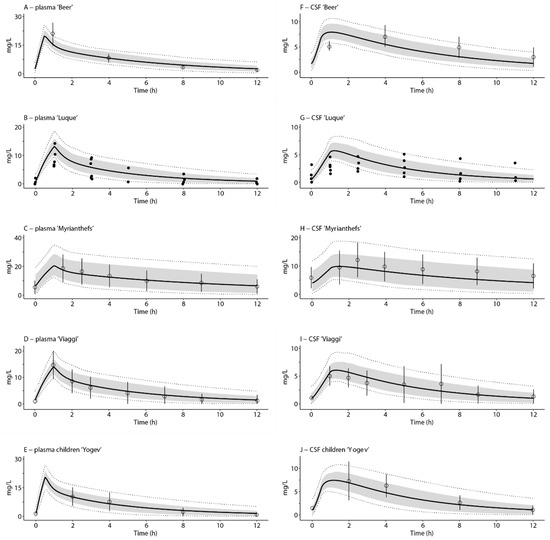 Simulations of linezolid concentration–time profiles in plasma (A–E) and cranial CSF (F–J) in critically ill adult and paediatric patients. Figures relate to intravenous administration of 600 mg linezolid twice daily for >two days in adults, as well as 10 mg/kg intravenous administration twice daily for two days in children (0.25–21 years). The x-axis indicates time after the last dose. The solid black lines indicate mean simulated profiles, the grey areas represent the area between the 16th and 84th percentile (equal to the standard deviation) of the mean, and the dotted lines indicate the 5th and 95th percentiles of the mean. Closed dots indicate measured individual data derived from the literature [6], and open circles indicate the mean with reported standard deviation derived from the literature [5,7,8,33]. The names in the headings of the figures relate to the first authors of the papers from which clinical data points were derived.