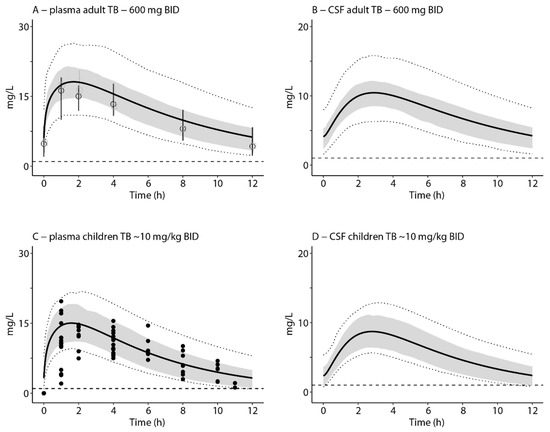 Simulations of linezolid concentration–time profiles in plasma and cranial CSF after 300 mg BID (A,B) and 1200 mg QD (C,D) in adult TB patients. The x-axis indicates time after the last dose. The solid black lines indicate simulation of the mean profile, and the dotted lines indicate the 5th and 95th percentiles of the mean. Simulations were performed based on plasma PK parameters values in adult TB patients as described by Diacon et al. (2020) [32]. Dashed horizontal lines indicate the MIC value of 1 mg/L linezolid for Mycobacterium tuberculosis [30,31]. In the clinical study provided, linezolid was provided as a monotherapy.