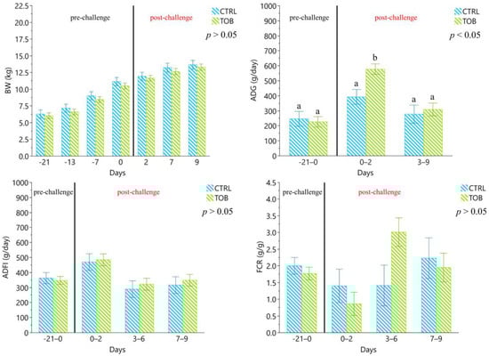 The body weight (BW), average daily gain (ADG), average daily feed intake (ADFI) and feed conversion ratio (FCR) did not differ during the immunization and post-challenge period for all the experimental groups (Figure 1).