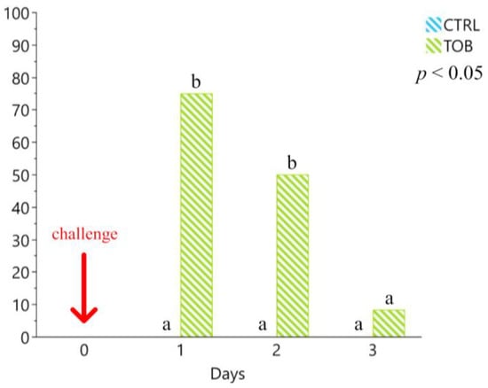 Faecal shedding of the O138 E. coli challenge strain after experimental infection for the challenged control (CT) and the challenged treatment (UT) groups during the first five days post-challenge. The experimental infection was represented by a single intragastric inoculum (5 mL) equivalent to 1 × 1010 O138 F18 E. coli colony-forming units (CFU)/5 mL and was performed at day 20. The arrow indicates the day of infection. The results are presented as percentages of positive animals per total animals per group for each day. a–b Different lowercase letters indicate statistically significant differences (p < 0.01). UC: unchallenged control group, UT: unchallenged treatment group, CC: challenged control group, CT: challenged treatment group. The results are presented as a percentage of positive samples per total animals for each group.
