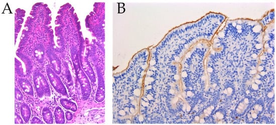 Histological sections of ileum samples at day 23. (A): Hematoxylin eosin stain of an ileum section of the challenged control group (CC), 200×. The presence of numerous inflammatory cells (lymphocytes, histiocytes, eosinophils) in the lamina propria of villi. (B): Immunohistochemistry for IgA in an ileum section of the unchallenged tobacco vaccinated group (UT), 200×. A positive signal of the presence of IgA is localized on the luminal surface of the enterocytes.
