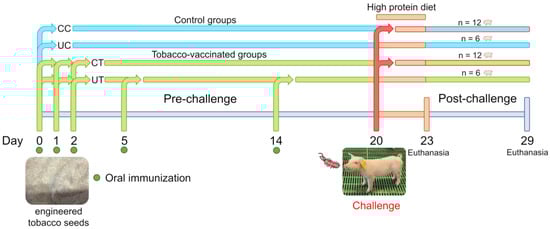 Experimental design from 0 to 29 days divided by immunization phase (pre-challenge) and post-challenge. C: control group fed wild-type tobacco seeds, T: treatment group fed engineered tobacco seeds, CC: challenged control group, UC: unchallenged control group, CT: challenged treatment group, UT: unchallenged treatment group.
