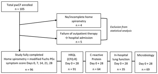 A total of 105 patients were included in the study. Due to missing data, nine patients were excluded, and statistical analyses were finally performed for 96 patients with complete home spirometry data. For the analysis of further outcome parameters and the analysis of response to therapy, only patients with complete data on day 0 and day 28 were included in the statistical analysis (see Figure 1).