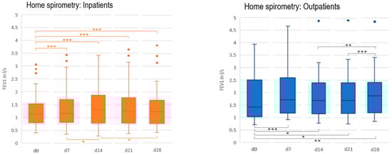 Home spirometry FEV1 (l/s) inpatients and outpatients, days 0–28. * p < 0.05, ** p < 0.01, *** p < 0.001.