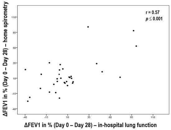 Correlation between home spirometry ΔFEV1 and in-hospital ΔFEV1 days 0–28.