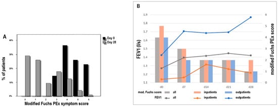 (A) Modified Fuchs BEx symptom score day 0 + day 28. Change between Day 0 and Day 28, % of patients. (B) Home spirometry + modified Fuchs BEx symptom score, day 0–28. The mean home spirometry FEV1 and Fuchs score from the start of therapy (day 0) and over the whole follow-up period (days 7, 14, 21, and 28) is presented for all patients (grey) and separately for inpatients (orange) and outpatients (blue).