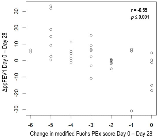 Correlation analysis ΔppFEV1/modified Fuchs score (days 0–28).