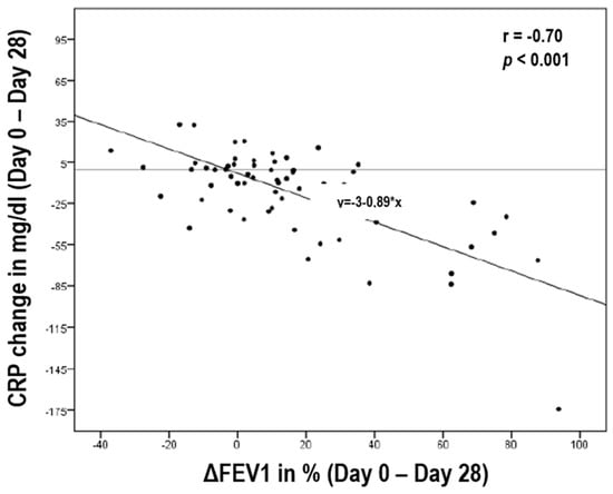 CRP also changed significantly on day 28 (please see Figure 6). The correlation analysis between change in CRP and ΔFEV1 also showed a strong negative correlation without a significant difference between inpatient and outpatient groups (please see Figure 7), suggesting that change in CRP is a valuable surrogate parameter for response to BEx therapy.