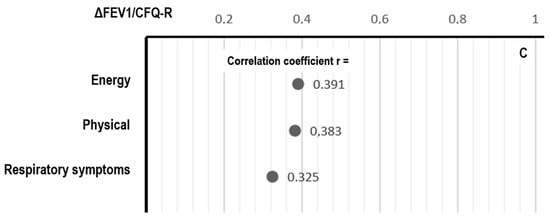 Correlations of medium effect strength were found between ΔFEV1 and some domains of the CFQ-R, with the strongest correlations shown for the domains “energy”, “physical functioning”, and “respiratory symptoms” (see Figure 8).