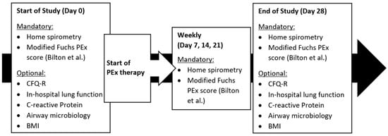 CFQ-R, in-hospital lung function, C-reactive protein, sputum microbiology, and body mass index were the additional parameters that were optionally collected. Follow-up examinations with home spirometry and collection of the symptom questionnaire were carried out at home on days 7, 14, and 21. All parameters were collected again during a follow-up examination on site on day 28 (see Figure 9). For home spirometry, patients were given a respiratory monitor (asma-1TM, model 4000, BS EN ISO 23747: 2007, manufacturer: Vitalograph®) on day 0. The handling of the device was explained in detail to each patient to ensure that they were able to perform the measurements independently. The measurement consisted of a series of three FEV1 measurements taken a few minutes apart. The CFQ-R questionnaire has nine quality of life domains (physical, role/school, vitality, emotion, social, body image, eating, treatment burden, and health perceptions) and three symptom scales (weight, respiratory, and digestion), each containing several items. The items are summed to produce range scores between 0 and 100, with higher values representing better health. Three different versions of the CFQ-R questionnaire were used depending on age group [37,38].