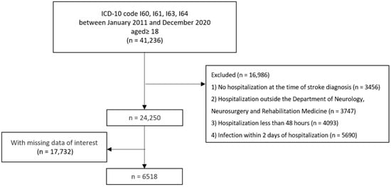 From January 2011 to December 2020, 41,236 patients aged 18 years or older were diagnosed with stroke. Of these, 24,250 patients fulfilled the criteria of hospitalization at the time of diagnosis, receiving treatment in a neurology, neurosurgery, or rehabilitation department, hospitalization for a duration exceeding 48 h, and absence of infection within 2 days of admission. The final sample for analysis comprised 6518 patients after excluding individuals with missing data of interest. A flowchart of the patient selection process is illustrated in Figure 1.