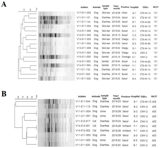 PFGE patterns E. coli ST131 (A) and E. coli ST405 (B) isolated from diseased dogs and cats in Korea.
