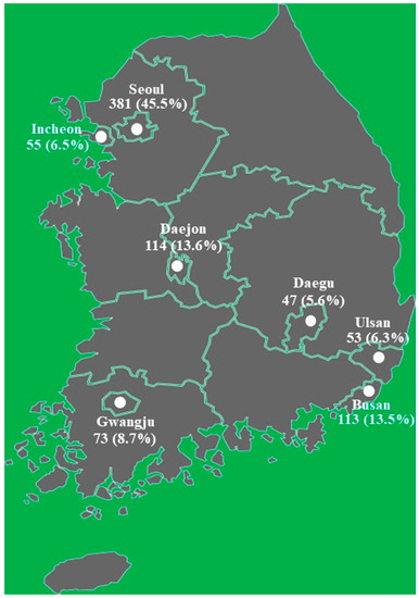 E. coli isolates were collected from seven different laboratories/centers participating in the Korean Veterinary Antimicrobial Resistance Monitoring System from 2018 to 2019. The isolates were recovered from the diarrhea, skin, ear canals, urine, and genitalia of dogs and cats. Samples were placed on ice and transported to the laboratories/centers within 6 h of collection. The number of isolates collected from different veterinary hospitals in each city is shown in Figure 2. However, the authors do not have information about the history of antimicrobial use in dogs and cats, and the number of samples considered for this study.