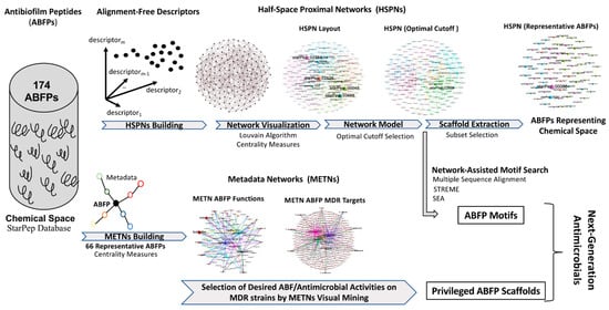 Alongside this previously mentioned procedure, the metadata associated with both the most central and atypical peptides were analyzed by the visual mining of complex networks, integrating additional relevant properties for the antibiofilm action and for the discovery/design of next-generation antimicrobial agents able to combat MDR infections. On the other hand, the proposed network-assisted motif discovery allowed the identification of ABFP motifs by AB and AF approaches within the communities of the HSPN model.