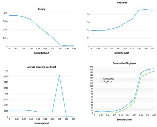 Then, some network parameters were retrieved at different similarity cutoffs in order to determine the optimal parameter for determining the most informative network topology. In relevance order, network parameters such as density, modularity, average clustering coefficient and number of communities were analyzed (Figure 2).