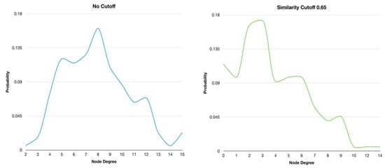 In addition, the degree distributions of the HSPN with no similarity cutoff and at 0.65 were plotted to explore the behavior of these networks as generic models [49]. The node degree distribution of HSPN with no cutoff shows a bell-shaped distribution around a maximum value of 8 (Figure 3 and Supplementary File S1). This bell-shaped distribution is inherent from the random models. However, when the optimal similarity cutoff is applied, the maximum value is reached at node degree 3, and the classical bell-shaped distribution is lost. Instead, several small bell-shaped patterns with peaks appear within the node degree intervals. Therefore, the HSPN model evidently does not display random behavior, which indicates that it could be used as a topological network model (Figure 3 and Supplementary File S1).