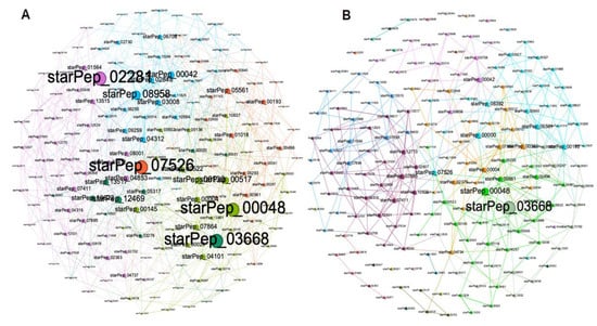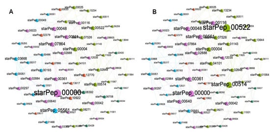 The main goal of extracting a reduced subset representing the complex networks is to enable the retrieval of useful information from visual inspection of the networks. With a reduced number of nodes and edges, complex networks become more legible for the human eyes, and the representativeness of the subset is also useful for multi-reference similarity searches against unlabeled peptides. Figure 7 shows the HSPN constructed from the reduced space, which is made up of 66 ABFPs resulting from the HC ∪ HB of the subset 7 (cutoff 0.40). As can be seen in Figure 7A,B, most of the main ABFPs identified in the HSPN model were transferred to the reduced space; such is the case for starPep_00000, starPep_00042, starPep_00048, starPep_03668, starPep_05561 and starPep_00004, which additionally were among the ten most relevant ABFPs, as ranked by the HC and HB centralities (Table 1). Its noteworthy that other ABFPs not identified among the top-ranked in the HSPN model were brought up significantly when constructing the HSPN with 66 representatives, e.g., starPep_00522 and starPep_00514 (Figure 7A,B and Supplementary File S4).
