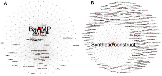 As shown in Figure 5A, the 174 ABFPs registered in StarPepDB were mainly collected from BaAMP [27], the Structurally Annotated Therapeutic database (SATPdb) [58] and Database of Antimicrobial Activity and Structure of Peptides (DBAASP) [59], which are represented by larger nodes with the highest connection with the ABFPs. While BaAMP and DBAASP entries were carefully collected from the literature, the SATPdb was built from 22 peptide databases that included BaAMP [27] and others similarly dedicated to specific activities such as AVPdb (antiviral) [60], ParaPep (anti parasitic) [61], Hemolytik (hemolytic) [62], CancerPPD (anticancer) [63], etc. It was also built from generic AMP databases such as DAMPD [64], APD [25], CAMP [65], LAMP [66], DRAMP [67], etc. Such databases that integrated SATPdb were represented as smaller red nodes, sharing fewer edges with the ABFPs.