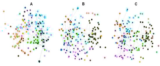 On the other hand, the average clustering coefficient (ACC) is a global measure of nodes’ neighborhood connectivity and can also be used for evaluating network topology changes against similarity thresholds. Although at a similarity cutoff of 0.80 all network parameters displayed a dramatical change (Figure 2), the optimal value was selected by jointly analyzing all HSPN parameters and topologies (Supplementary File S1). The point at which the network density dramatically drops but at the same time the modularity increases (while considering the trade-off between the number of communities/singletons generated) is a good starting criterion for selection. In this sense, the cutoff value should be between 0.6–0.7, where the density and modularity have an inverse behavior, while the ACC does not suffer any dramatic change and the number of communities and singletons are reasonable in order to display an informative network topology (Figure 2). Thus, the optimal cutoff of 0.65 was selected by analyzing all the HSPN parameters displayed in Figure 1 and Supplementary File S1, and the networks’ topologies as well. The selected HSPN (cutoff = 0.65) was the best network, projecting the antibiofilm chemical space and grouping the ABFPs in a reasonable number of both interconnected and isolated communities, in which their peptides probably share common or singular physicochemical and biological properties. The relevance of this HSPN will be addressed from now on.