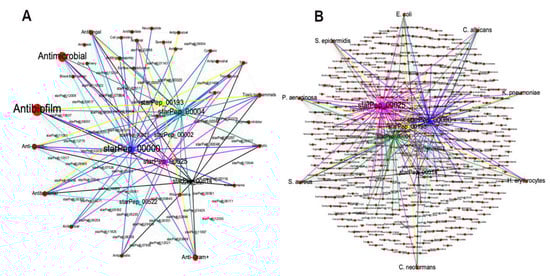 Figure 8A is organized in such a way that the desired activities were placed outside at the left part of the METN, and the undesired ones at the right. The six candidates under study, in addition to antibiofilm activity also have antifungal and the antibacterial properties, specifically against Gram-positive and Gram-negative strains, which are very convenient for developing next-generation antimicrobial agents able to target both planktonic and biofilm microbial forms. However, four of them were reported as hemolytic, and five as “toxic to mammals”. The peptide starPep_00522 (in cyan) is the only one that was neither reported as “hemolytic” nor “toxic to mammals”, and therefore its peptidic scaffold can be used for developing antibiofilm agents for clinical purposes. Additionally, Figure 8B also shows that starPep_00522 has been evaluated in Escherichia. coli, Pseudomonas aeruginosa, Candida albicans, and Cryptococcus neoformans, of which the two first targets are classified as ESKAPEE pathogens, considered the most threatening antimicrobial-resistant microbes [68]. This visual analysis of the METNs can be extended to all 66 ABFPs of the representative set.
