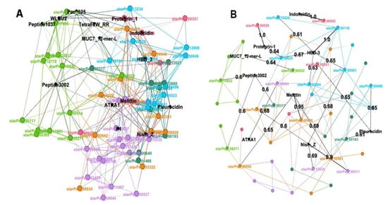 (A) HSPNs’ visualization using the Fruchterman–Reingold layout, without similarity cutoff and (B) with a similarity cutoff of 0.65. Peptides communities are represented by different colors, while the nodes’ size was scaled according to node degree.