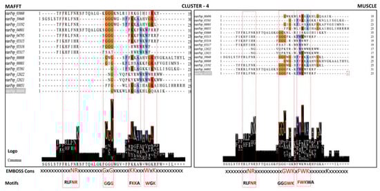 - The conserved motifs were detected by jointly analyzing the consensus sequences and Seq2Logo, implemented in the Jalview v2.11.2.5 program [44] and EMBOSS Cons v6.6.0, available at https://www.ebi.ac.uk/Tools/msa/emboss_cons, EMBL-EBI, Cambridgeshire, UK, accessed on 22 December 2022).