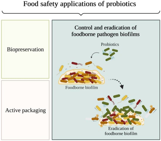 In addition to their use in functional foods and dietary supplements, probiotics have been studied for applications in food safety assurance (Figure 1) as a promising strategy for food biopreservation, active food packaging, and prevention and control of biofilm formation in the food industry [5,9]. Biopreservation is a hurdle approach that is applied to extend the shelf life and prevent food spoilage using specific microorganisms and their antimicrobial products (e.g., organic acids, hydrogen peroxide, and bacteriocins) [9]. The combination of hurdles, such as probiotics and non-thermal technologies, can ensure that all pathogens are eliminated or rendered harmless in the final food product. Indeed, it has been reported that non-thermal techniques induce the formation of compounds that promote the growth and survival rates of beneficial microbes in food, making food products safer for consumption [10].