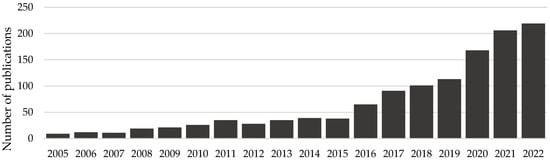 Number of scientific articles published on the PubMed database from 2005 to 2022 upon the search for “probiotic” and “biofilm” keywords.