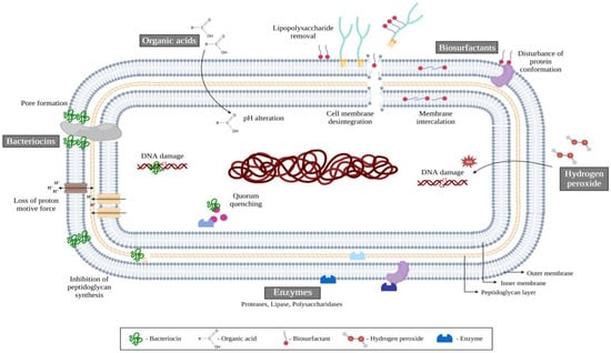 Mechanisms of action of probiotics against foodborne microorganisms. Bacteriocins can induce cell death by dissipating the proton motive force and disrupting bacterial membranes. Organic acids lead to a decrease in pH, impairing the growth of microorganisms. Biosurfactants affect cell surface compounds, causing membrane disintegration. Hydrogen peroxide can damage biomolecules such as DNA. Enzymes can target and damage extracellular proteins, exopolysaccharides, DNA, or QS molecules. Adapted from [30,43].
