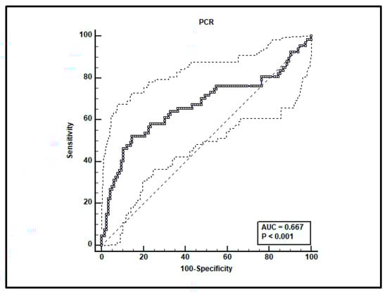 Continuous data were presented as median and interquartile range (IQR), whereas categorial variables were expressed as count and percentage. The C/D was used as a surrogate marker of total clearance by dividing voriconazole Cmin by daily dose per kg of body weight. ROC curve analysis was carried out by using on the one hand CRP or PCT values as the test variable, and on the other hand voriconazole C/D ratio > 0.375 (equivalent to a Cmin value of 3 mg/L normalized to the MD of 8 mg/kg/day) as the state variable and defined as toxic level [,]. AUC along with 95% CI were calculated. The optimal cut-off point was computed by means of the Youden Index method. The Youden Index was calculated according to the following equation: sensitivity (%) + specificity (%) − 100. A p value < 0.05 was considered significant. Statistical analysis was performed by using the MedCalc for Windows (MedCalc statistical software, version 19.6.1, MedCalc Software Ltd., Ostend, Belgium). The study was approved by the Ethics Committee of IRCCS Azienda Ospedaliero-Universitaria of Bologna (n. 442/2021/Oss/AOUBo approved on 28 June 2021).