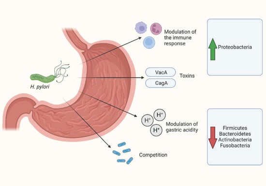One of the main virulence factors of H. pylori, the cytotoxin-associated gene A (CagA), is capable of impairing cellular proliferation, apoptosis, cell motility, inflammatory response, and the arrangement of the cytoskeleton in host cells [15] and may also lead to gastric dysbiosis. In a transgenic Drosophila model of CagA expression, without the presence of H. pylori, Jones et al. observed that the virulence protein altered the host microbiota. Moreover, they found the increased activation of innate immunity to be a consequence of CagA-induced dysbiosis [70]. Furthermore, Wang et al. showed that in the gastric biopsies of patients affected by chronic gastritis or gastric cancer, the presence of different CagA and VacA virulence genotypes influenced the gastric microbiome’s composition [71].