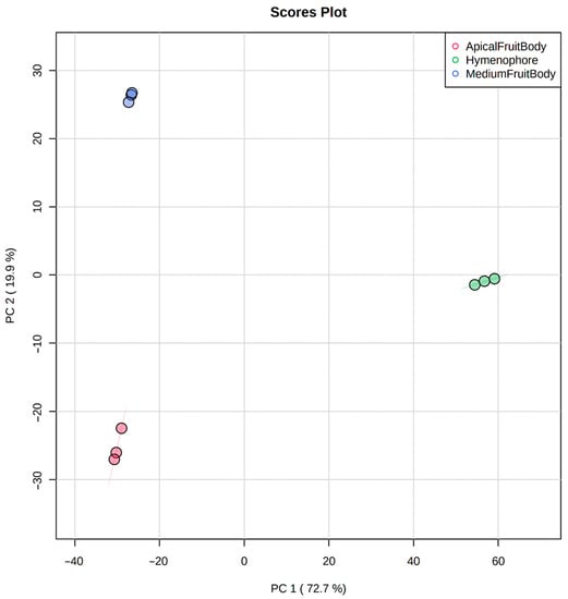 Metabolomics provides a quantitative and/or qualitative estimation of all low metabolites (small molecules with a molecular weight of less than 1800 Da) present in biological systems, for instance, fungi, plants, animals, and prokaryotes [10,11]. In recent years, metabolomics has emerged as an important methodology to determine the temporal and spatial correlations between metabolic cues and associated phenotypes in mushroom species [12]. A large number of studies elucidated the gamut of important metabolites in F. officinalis for their organoleptic properties, flavor, and nutritional and functional aspects, particularly anticancer potential [13,14]. Although the majority of studies characterized the lanostane-type triterpenoids class of secondary metabolites from F. officinalis [15,16,17,18], the spatial distribution of primary and secondary metabolomes in different mushroom parts is largely unknown with respect to the associated phenotypes.