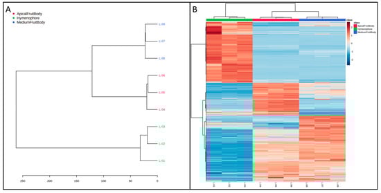 (A) Dendrogram and (B) heat map confirming that the samples were mainly divided into two clusters: hymenium and fruiting body. The latter was divided into the medium and apical clusters. Heat-map analysis shows that some characteristics were overexpressed only in the hymenophore, others only in the apical part of the fruiting body, and others only in the middle part of the fruiting body.