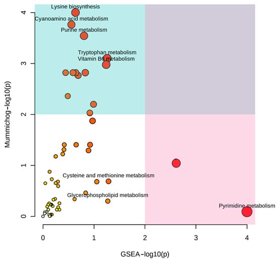 The data were loaded into the MetaboAnalyst functional analysis module, which performs a putative annotation of the features on the basis of m/z and RT values obtained from spectrometric analysis. A putative list of 505 annotated metabolites (AnnotatiMetaboAnalyst.csv) was used to determine the active metabolic pathways using the Mummichog and GSEA algorithms. The result sof this analysis are shown in Figure 3, where the abscissa and ordinate show the −log10 of the p-value calculated with the GSEA and Mummichog algorithms, respectively. The size of the circles represents the enrichment factor of each pathway; the color fades from yellow into red in proportion to the −log10 of the probability that a given pathway was active. The pathways that were statistically significantly active in the hymenium with respect to the fruiting body fell into the upper and right quadrants of the figure. A total of 60 metabolic pathways were identified; the complete data are in the table “Results_mummichog_integ_pathway_enrichment”.